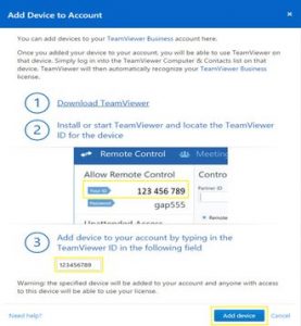 - Dialog Add Device to Account akan terbuka, masukkan di bawah poin 3 ID TeamViewer dari perangkat pertama yang ingin Anda gunakan untuk koneksi TeamViewer komersial.